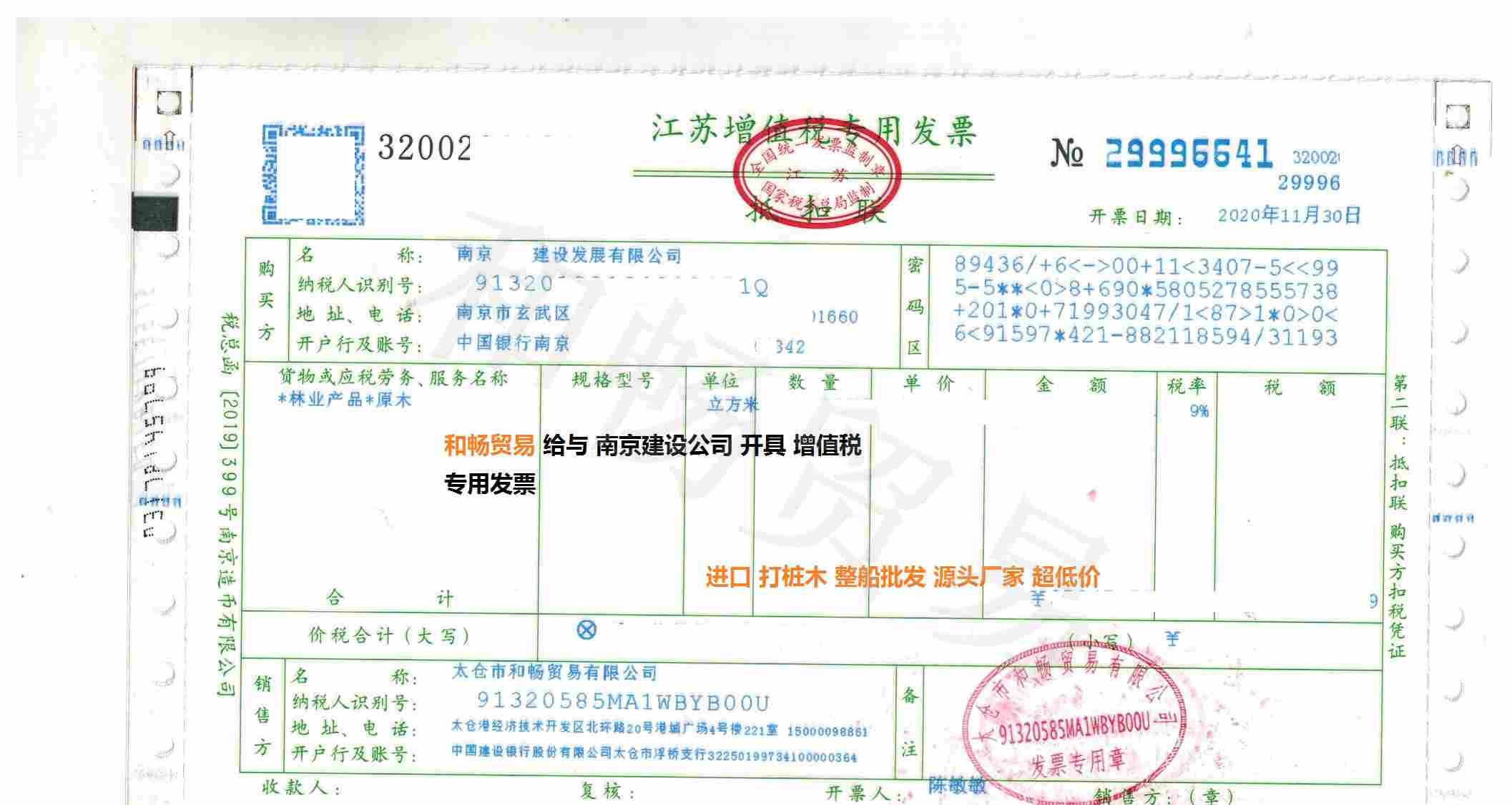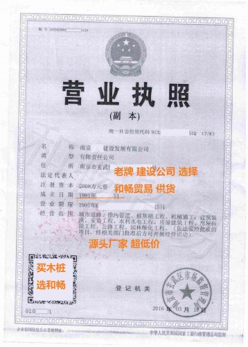 南京大型建设集团采购和畅贸易打桩木 2020.11月南京大型建设集团选择了和畅贸易提供的松木桩,落叶松打桩木, 3米和4米口径在10cm和12cm 分别总计采购量27000根, 营业执照由南京建设集团